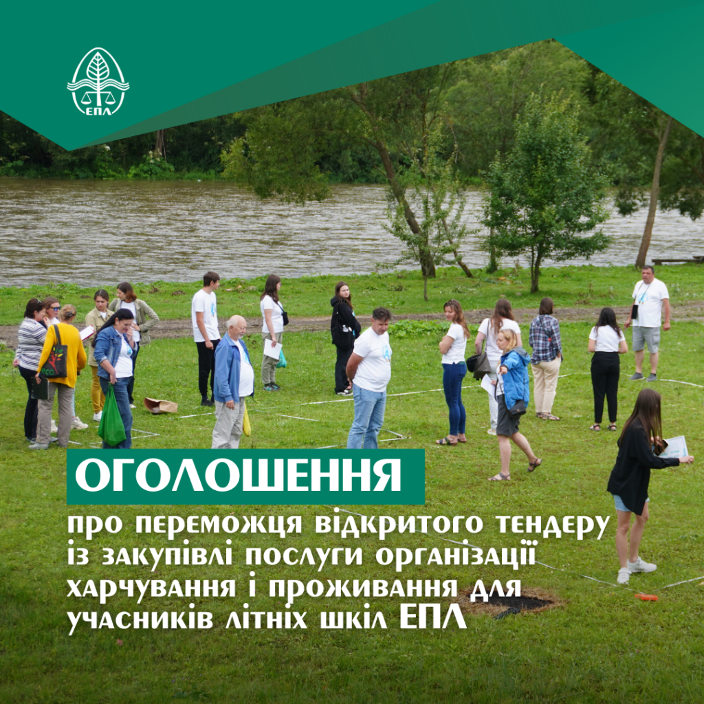 ЕПЛ (надалі – Організація) для підвищення якості і прозорості своєї фінансової діяльності та з метою дотримання антикорупційної політики провела відкритий тендер на закупівлю послуги організації харчування і проживання учасників літніх шкіл євроінтеграторів та випускників онлайн курсу “Інструменти зеленого повоєнного відновлення довкілля”