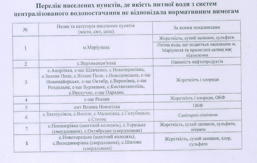 У Донецькій області протягом 2015 року відхилення було виявлено у 61,3 % пробах, а у 2014 році у 44,6 % пробах. Вода не відповідала нормам у м. Маріуполі та Першотравневому районі за показниками вмісту аміаку. За показниками мікробіологічної безпеки відхилення встановлені у 15,4 % пробах: по м. Маріуполю – 20,4 % та в першотравневому районі – 7,8 %.