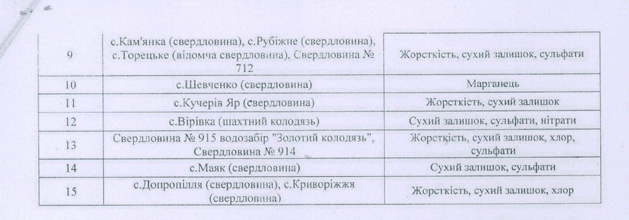 | 90 % | Сухий залишок, залізо, нітрати, жорсткість, забарвлення | Донецька | Волноваський район |