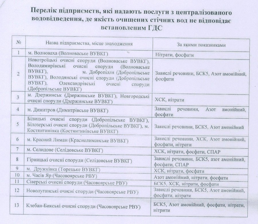 | 100 % | Сухий злишок, жорсткість, зважені речовини, сульфати, хлориди, залізо, аміак | Донецька | м. Селідове, м. Дзержинськ, м. Костянтинівка, м. Дружківка, м. Добропілля, м. Красноармійськ |