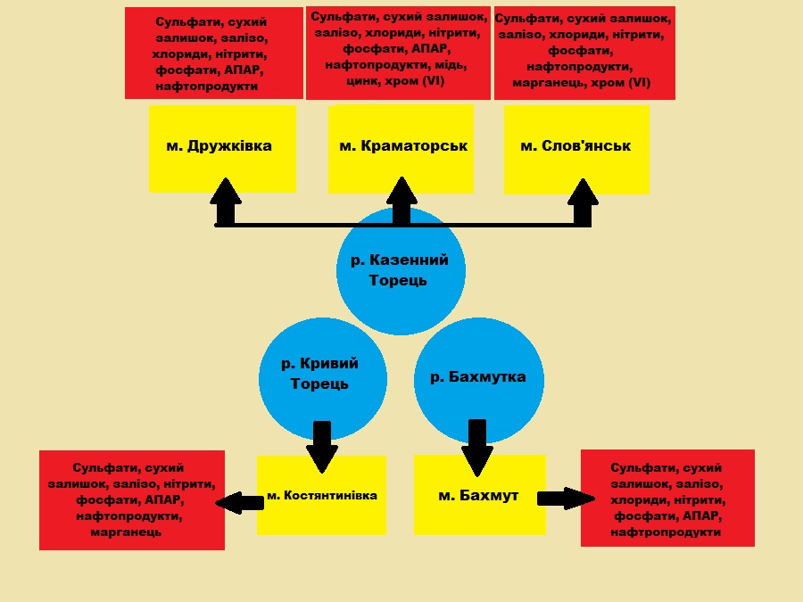 Екоінспеція повідомила, що в усіх річках Сіверсько-Донецького басейну, де здійснювався відбір проб у 2014-2016 роках, було зафіксовано перевищення ГДК за деякими показниками (див. Додатки Схема). Зокрема, перевищення було зафіксовано в річках р. Кривий Торець (м. Костянтинівка), р. Казенний Торець (м. Дружківка, м. Краматорськ, м. Слов’янськ), р. Бахмутка (м. Бахмут).