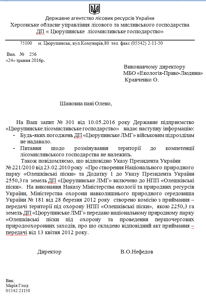 ДП «Цюрупинське лісомисливське господарство» повідомило МБО “Екологія-Право-Людина” (лист № 256 «24» травня 2016 р.) про те, що будь-яких рішень та інших розпорядчих документів, щодо перебування військових на території Олешківських пісків на території підприємства немає; будь-яких погоджень ДП «Цюрупинське ЛМГ» військовим підрозділам не надавало.